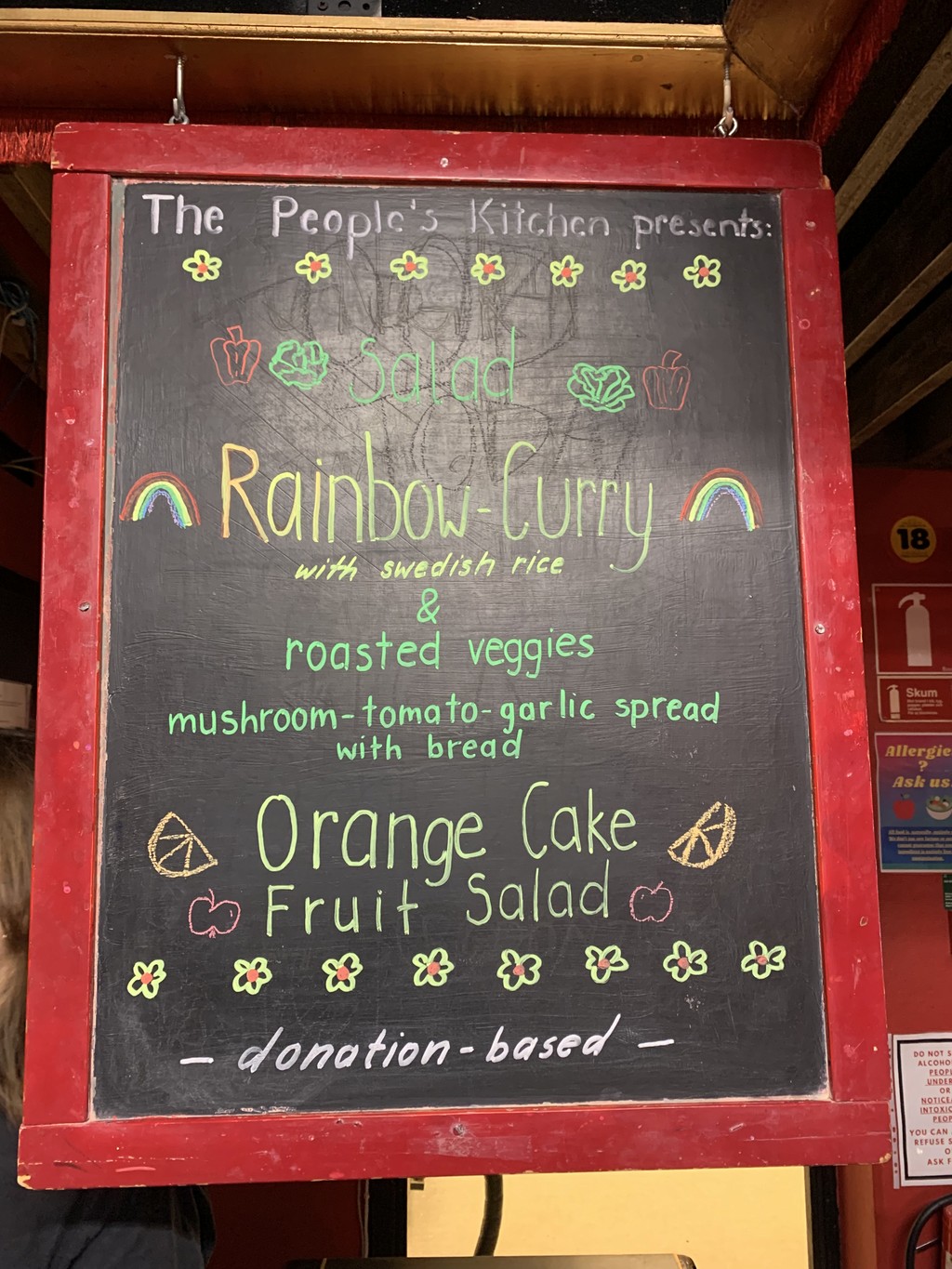 We serve a delightful array of healthy and delicious vegan dishes. Depending on what ingredients we save, a serving includes one main dish consisting of salad, savory protein, and a carb, followed by a dessert. We also have a bread basket (donated by Ramklints bakery in Lund) that you can freely pick from.